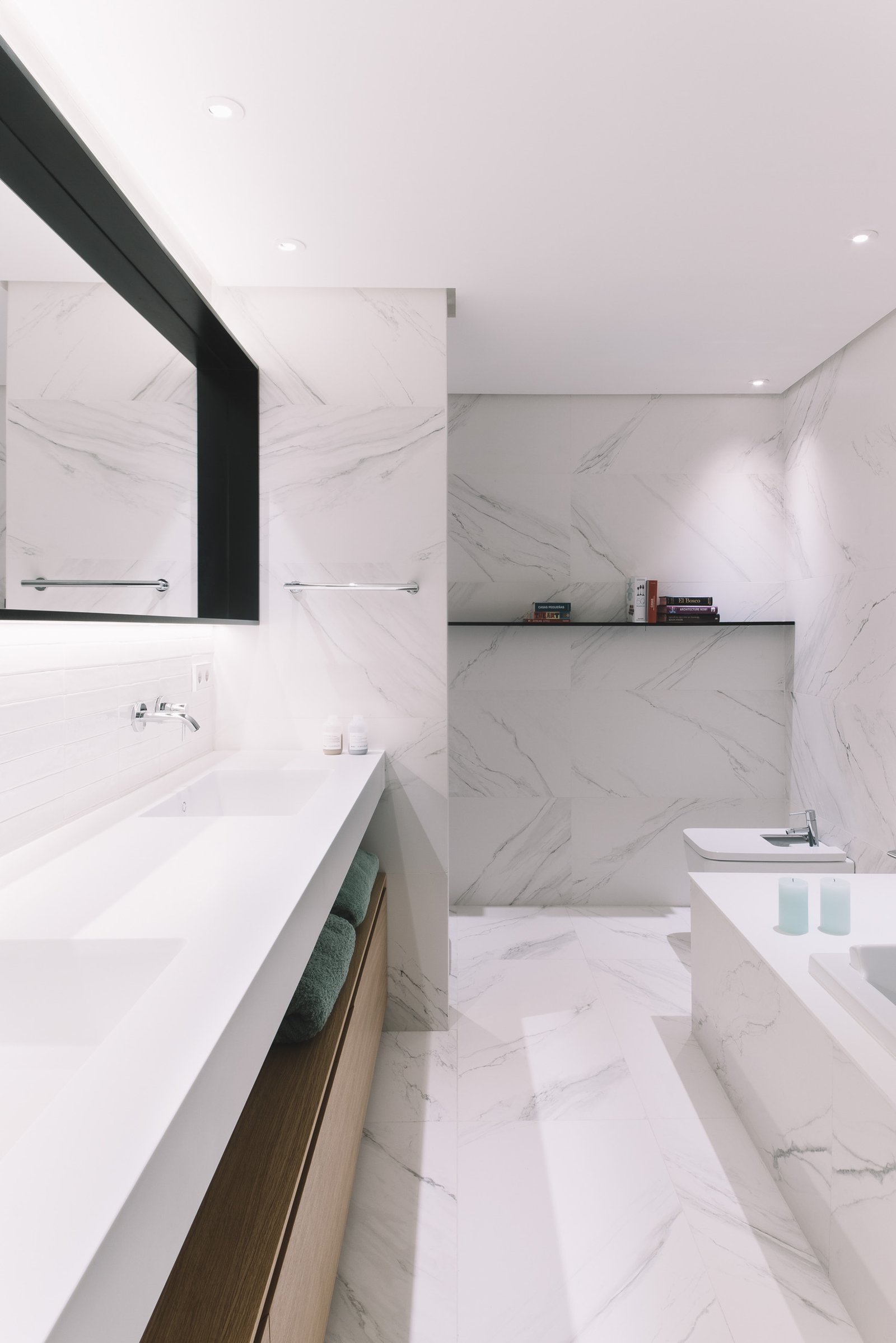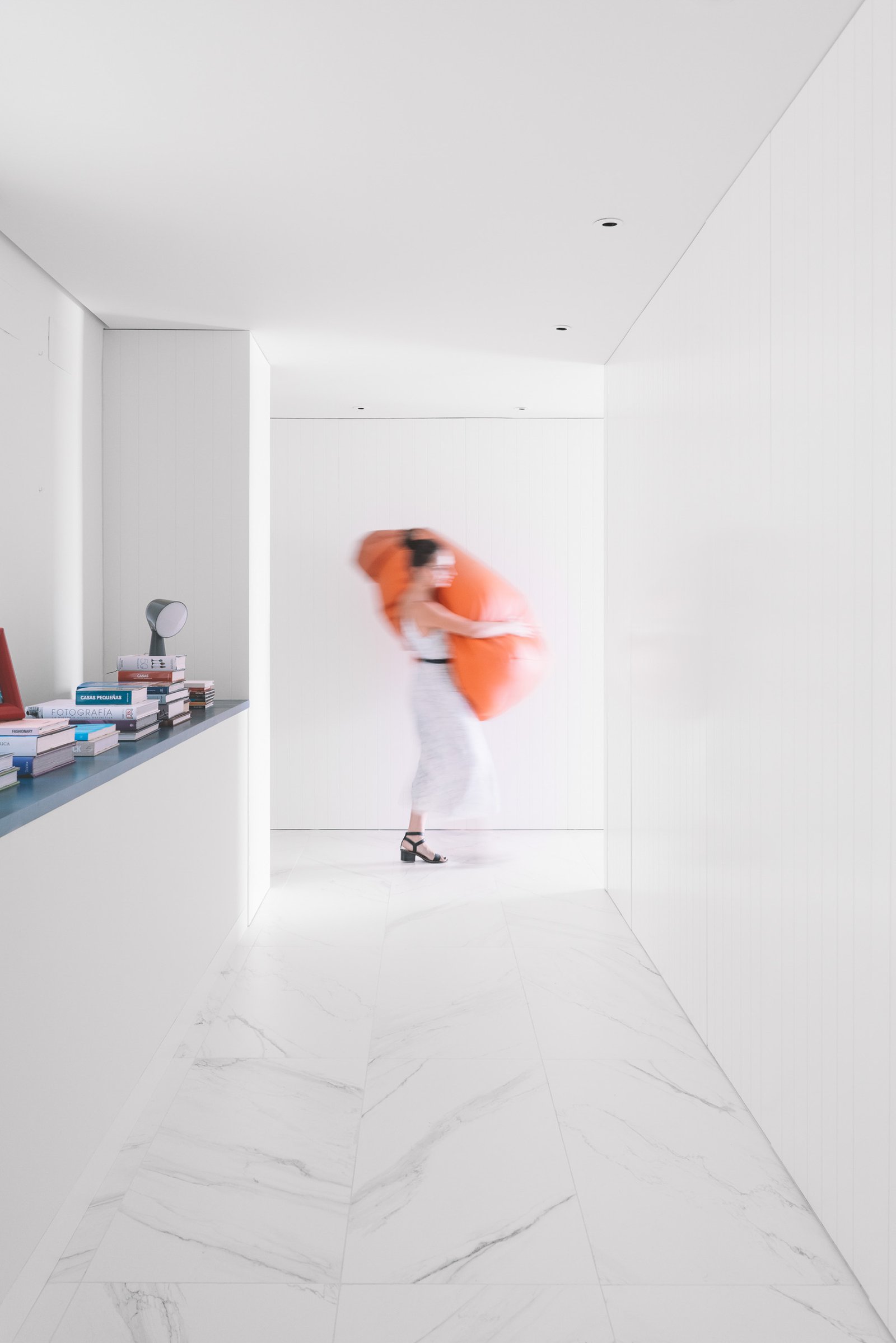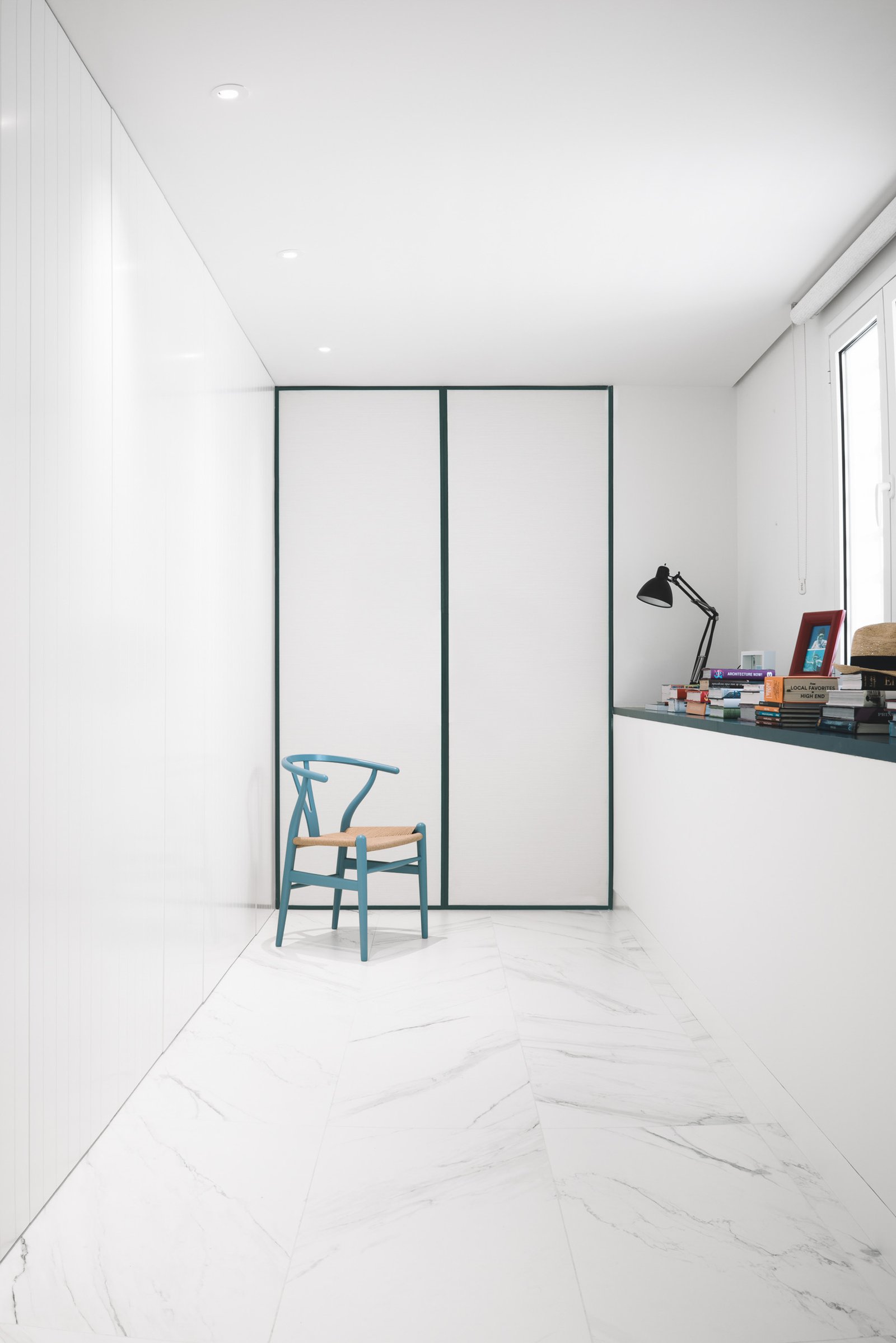 An impeccable interplay of bespoke white wardrobes connects the spaces, bringing rhythm and storage to the home. the whiteness in floor and wardrobes mixed with cold tones fill the house of light & a fresh air.