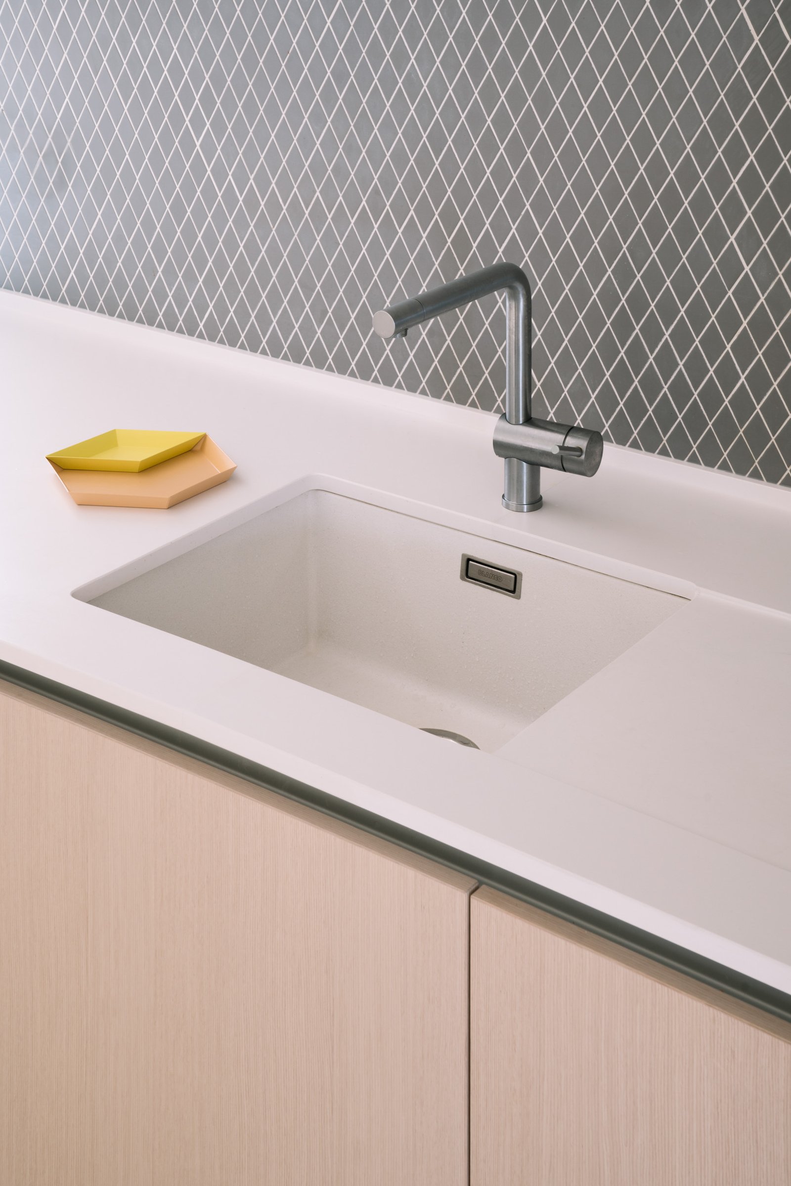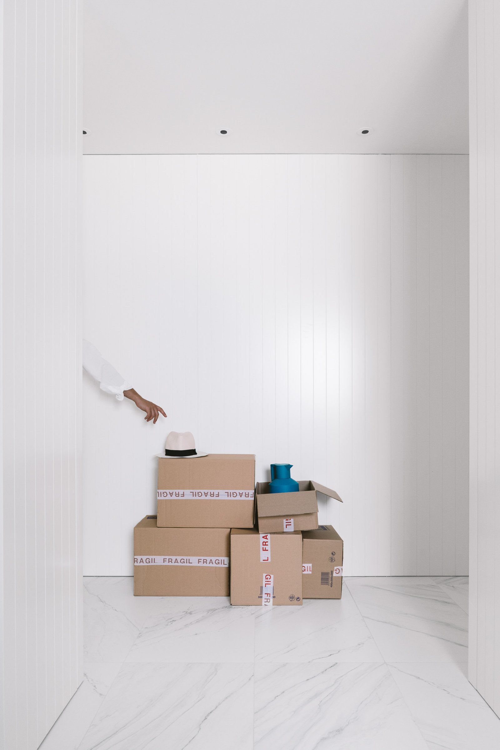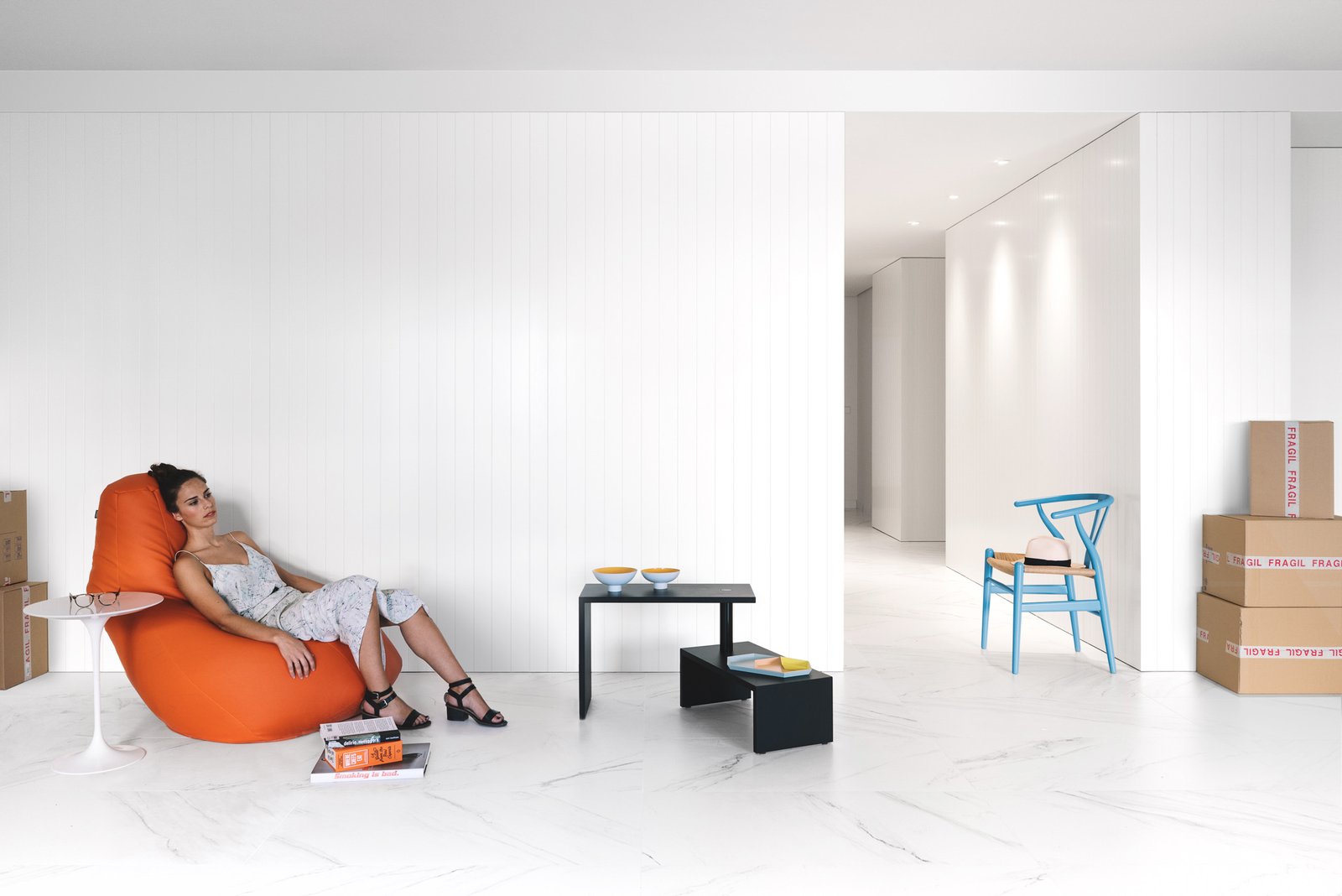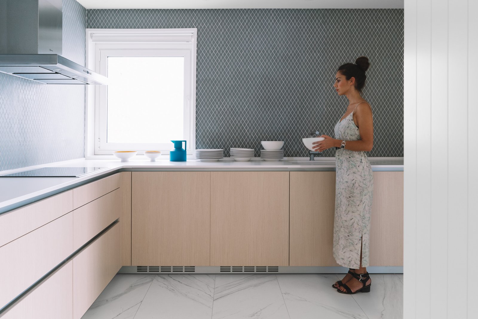 An impeccable interplay of bespoke white wardrobes connects the spaces, bringing rhythm and storage to the home. the whiteness in floor and wardrobes mixed with cold tones fill the house of light & a fresh air.